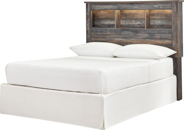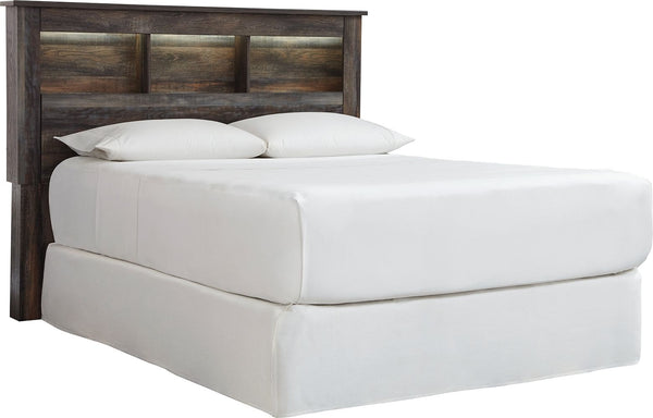 When merged in just the right way, rustic and industrial styles can make one happy marriage. Case in point: this bookcase headboard. A refined take on barn board beauty, its complex, replicated wood grain showcases hints of burnt orange and teal tones for a sense of weatherworn authenticity. Three open cubbies lined with a dimming LED light strip keep bedtime reads top of mind.