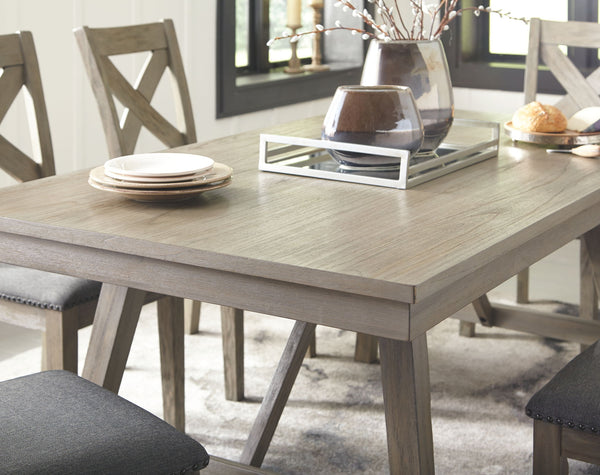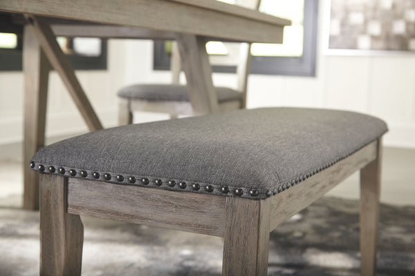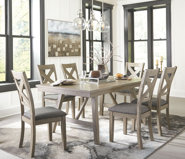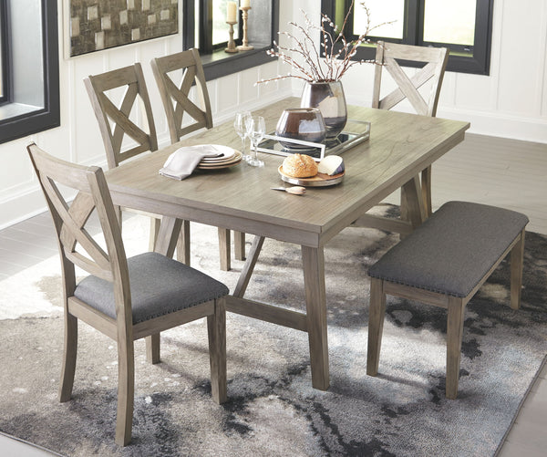 Table is constructed with hardwood solids and Mindi veneer. Dining chair and bench made with hardwood solids. A trendy wire brushed texture finished with an antiqued gray color. Table features a cross-buck trestle design and thick farmhouse styled top. The dining chair has a sturdy "X" back silhouette and cushion seat trimmed with nails and a soft dark gray fabric cover.