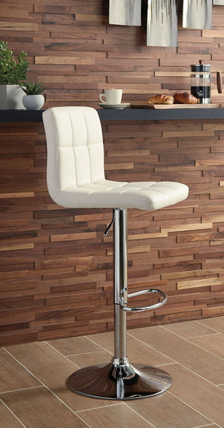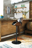 Here's a bar stool that rises to the occasion. It is sleek and modern-meets-retro with chrome-tone accents, quick curves and a contrasting brown finish. Bone-colored faux leather upholstery elevates this bar stool. Influenced by a cool 70s vibe, it easily adjusts from counter to pub height, making the stool as versatile as it is attractive. This tall swivel bar stool is a perfect seat for any trendy home bar or game room.