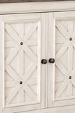 Unique two-tone finish with a combination of Oak and Acacia substrates combining a trendy textured antique white color with table and server tops finished in a textural weathered oak finish. Rectangular dining table features six convenient drawers for storing smaller items. The -02 upholstered host chair inspired by the trendy deconstructed styles for casual living. The -01 side chairs feature a boxed cushion seat. All chairs feature a heavy woven fabric for added textural qualities. The large capacity server has three doors with lattice design. The tall bunching unit has two drawers, three shelves and open lattice sides. D647-32 rectangular counter table features four convenient drawers for storing smaller items. All chairs feature a heavy woven fabric for added textural qualities. D647-13 round drop leaf counter table converts to smaller square version and has a shelf for storage. The D647-42 table will seat four guests with storage cabinet on one end. Storage cabinet has a drawer located at the bottom with a single adjustable shelf located behind two doors above. D647-09 is made with solid wood, veneer and engineered wood substrate in antique white. Heavy woven polyester fabric with nail head trim.