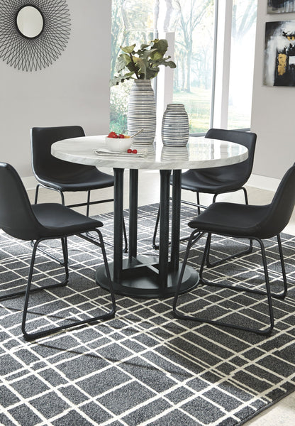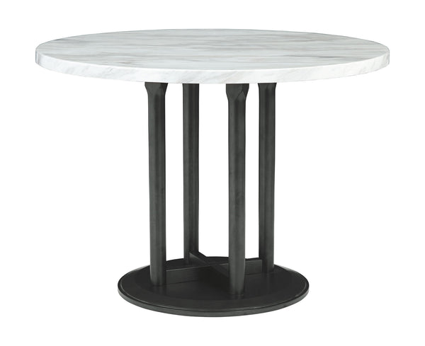 With its distinctive X-shaped metal base, this round dining table serves up a fresh twist on mid-century inspired style. Its mixed material and two-tone aesthetic are beautifully in balance. Sporting a dramatic charcoal gray hue, the top is crafted of durable melamine allowing it to weather years of family thrills and spills.