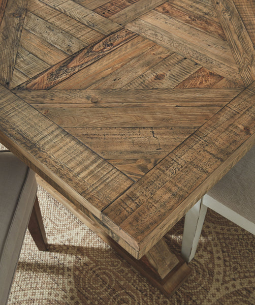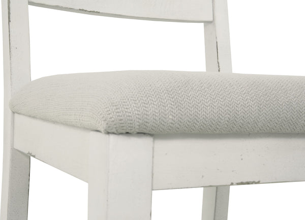 Made with Pine solids in a two-toned finish application. D754-50B table base and D754-01 chair have a textured white rub through finish. D754-125,-50T tables and -80 buffet are made with reclaimed pine solids in an trendy light grayish brown finish. D754-125 trestle dining table has a cross buck pedestal base and interesting inlay top with planked effect. Server has a chevron layup to coordinate with drawer and door storage. D754-01 chair has a broad rung ladder back design with light gray fabric cover or a stylish slip cover look with a linen like fabric. D754-01 side chair uses "Nuvella" performance fabric. D754-05 chair has a slat back design in an all-over light natural finish and seat cushion upholstered in a light tone performance fabric.