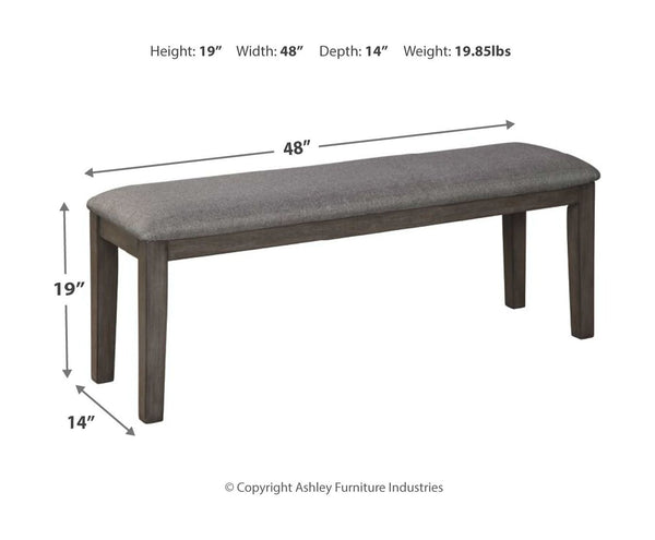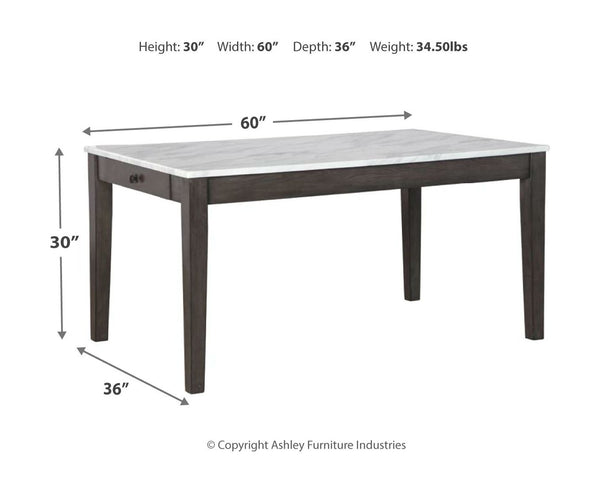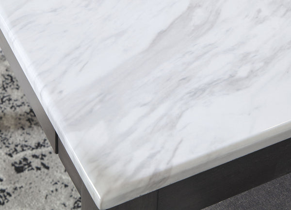 Clean, casual lifestyle design. A sleek dark charcoal gray finish is contrasted with beautiful faux Carrara marble table tops. The rectangle table features enough room for six and a convenient drawer for storing small items at each end. Made with select solid wood, veneer, paper print marble and engineered wood. The chair cushions are covered with a gray textured polyester fabric.
