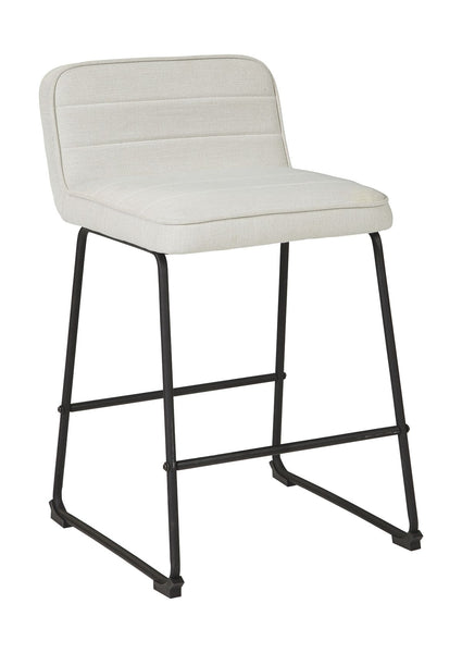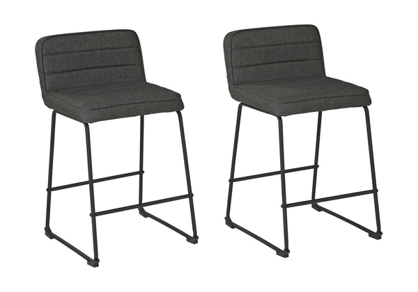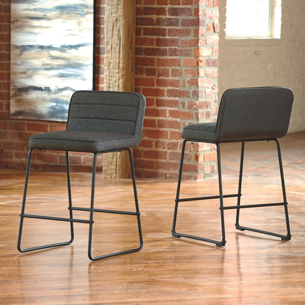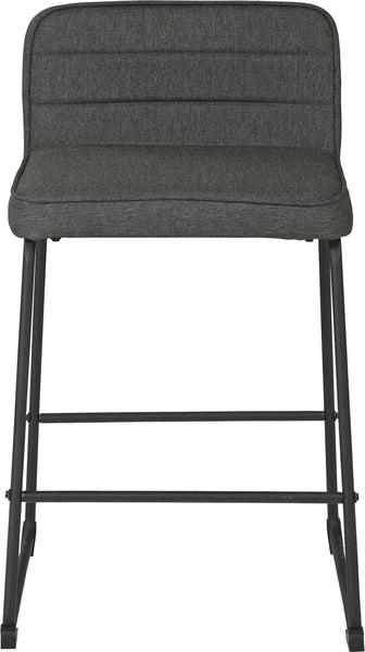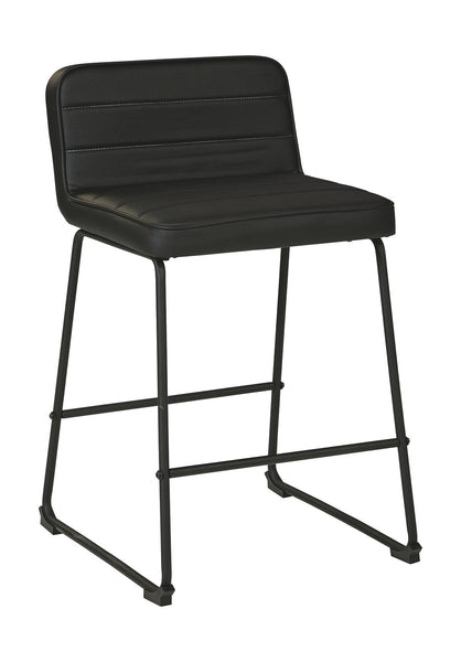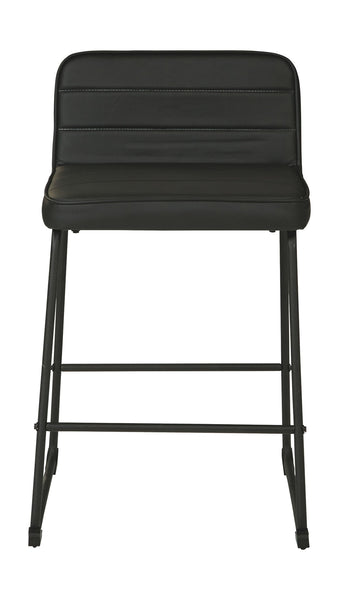 Serve up an ultra-contemporary look at a comfortably cool price with this low back bar stool. Sleek yet sturdy bar stool includes black tubular metal legs, comfortably cushioned seats wrapped in a sleek, black faux leather with distinctive horizontal channel detailing for a deliciously upscale aesthetic.
