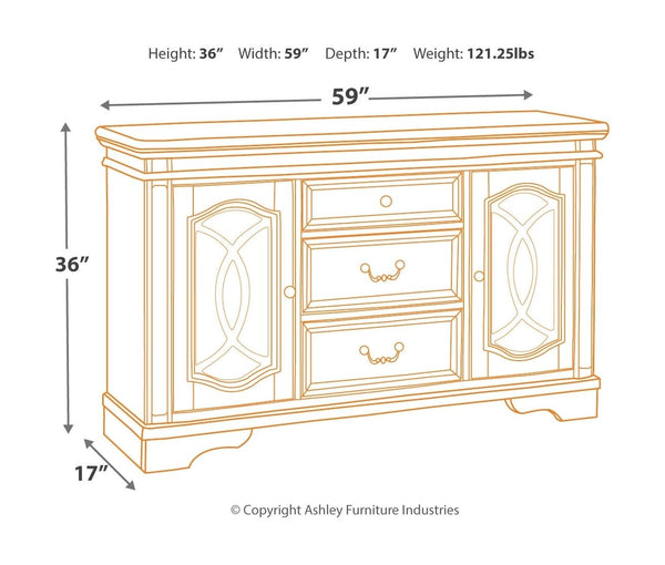 Traditional cottage design. Antiqued two-tone finish featuring chipped white with distressed wood finished tops. Tops feature Oak veneers, while the cases are made with birch veneers and hardwood solids. Framed drawer fronts and decorative fret laid over inset mirror door panels dress the server nicely. Dovetail drawer construction with ball bearing side glides. Round table extends to a large oval. Tapered table and chair legs. D743-01 casual traditional ladder back chair design. D743-02 stylized ribbon back chair design. D743-45 has a removable extension leaf and can accommodate up to 8 comfortably. D743-52 table is designed to go behind sofas and sectionals for entertaining and casual dining solutions. Open storage cubbies offer additional function for small spaces living. Backless swivel stools are constructed with solid wood frames. Foam cushioned seats are covered with a textured polyester fabric in an oatmeal color. D743-32 table is 54” x 36” and extends to 54” square. Top features flat cut oak veneer with a beautiful butterfly pattern. Soft seat ladder back stools.