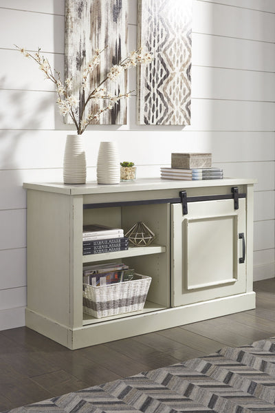 Made with paint grade materials and finished in a chipped white color. Unique casual look features canted and angled elements with farmhouse construction. Barn door hardware completes the look. Desk features angled leg structure, three drawers and an inset faux cement top. Credenza features a faux cement top and sliding barn door with dark gray hardware concealing open shelving. Optional angled shelving hutch. Bar pull hardware has an industrial look with dark gray finish.