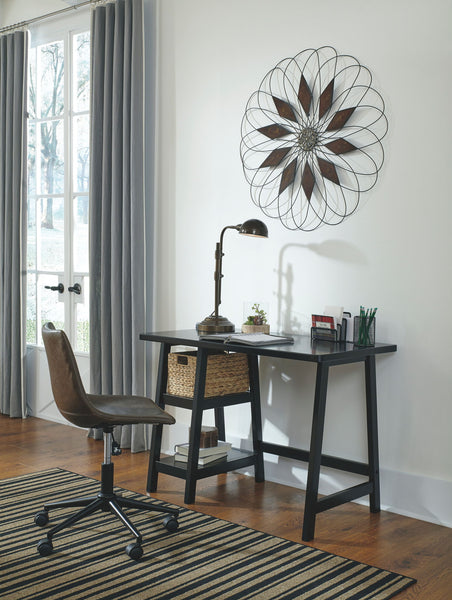 Space-challenged rooms call for simply chic style: like this small home office desk in antiqued blue. Clean and lean, this desk’s classic trestle design always works. Heavily distressed finish captures the essence of chipped paint, giving this wood desk a charming salvaged quality. Pair of open shelves and natural water hyacinth basket provide essential storage.