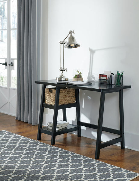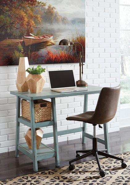 Made with select hardwood solids and paint grade materials. Painted in an antiqued blue or white finish for a vintage look. Or choose a clean black finish for a more contemporary feel. Small space living desk has classic trestle design based on our H309 desk form. Ample leg room and space to move. Left side of desk has shelf and natural toned rattan woven basket.
