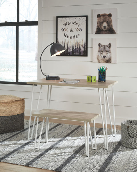 Whether for work or play, this sturdy and stylish desk with bench provides the perfect place to get it done. Mid-century modern hairpin legs and a durable melamine surface are a kid-friendly, small-space solution.