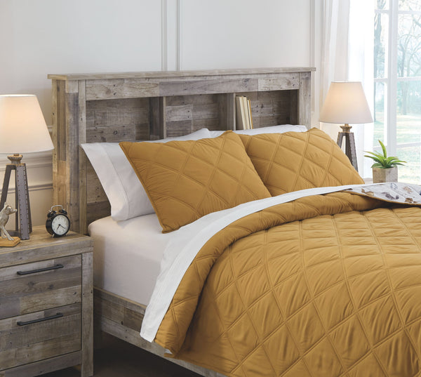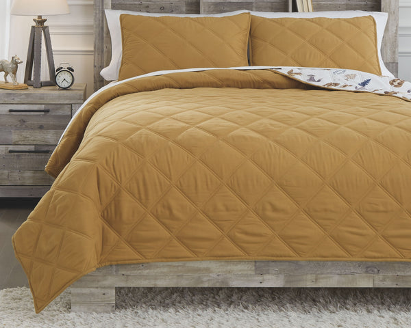 Bring the outdoors inside with this comforter set. The solid golden brown stitched geometric pattern reverses to a woodland animal design in shades of brown, navy and white. Perfect for the nature lover in your life.