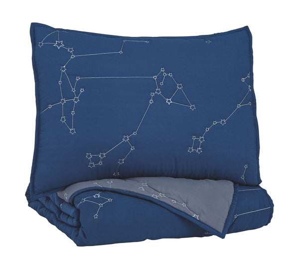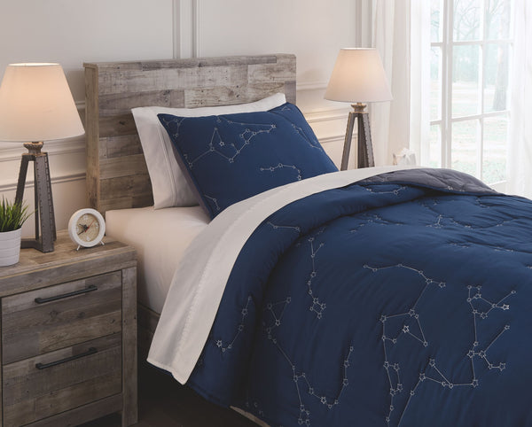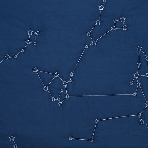 Create room for self-expression with this fun bedding set. Encourage your child’s interest in the stars and delight them with this comforter set. Solid navy and white embroidered constellations on one side reverses to gray with white embroidered constellations on the other. Rest assured, they’ll happily drift off to dreamland in a space that’s uniquely theirs.