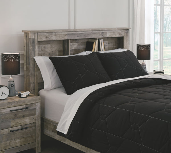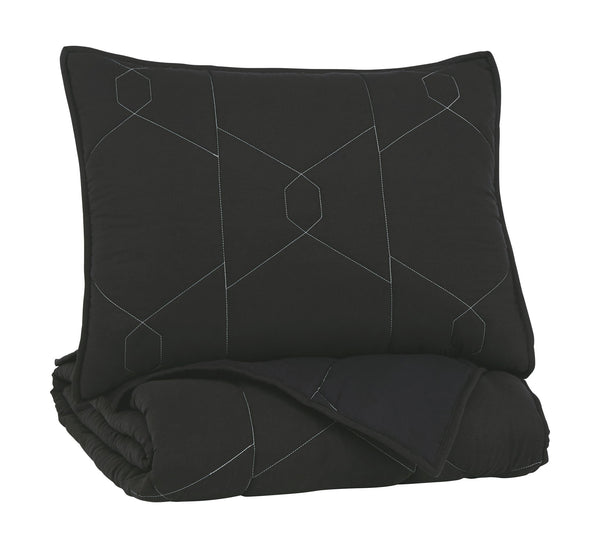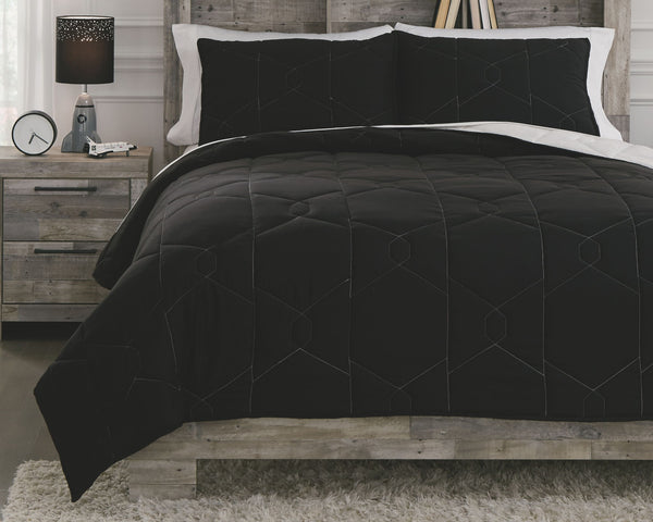 Double up on comfort and style with this reversible comforter set. The geometric pattern quilting incorporates cozy texture. The trendy palette of solid black with white stitching is reversible to an Ombre marble design in shades of black, white and gray allowing you to switch it up to suit your mood.