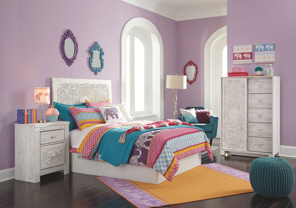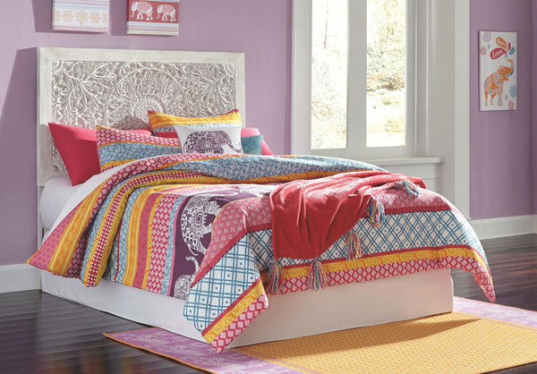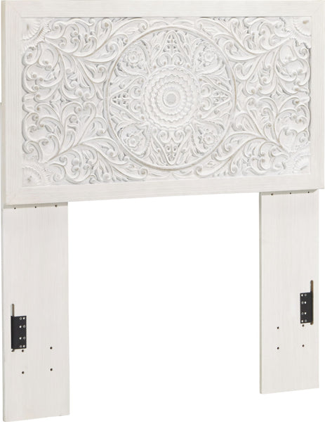 Your young trendsetter can live out her free spirit with this headboard. Exquisite carved medallion pattern is a testament to boho-chic style. Charming whitewashed finish sets a foundation for a room bursting with personality. Adjustable height design offers added flexibility.