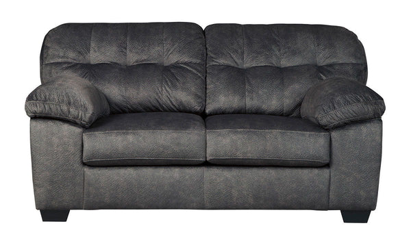 Looking for the perfect blend of decadent comfort and contemporary flair? Feast your eyes on this sensational loveseat. Tufted box cushioning and thick pillow top armrests brilliantly merge style and a sumptuous feel. Wonderfully plush to the touch, the loveseat's granite gray fabric is the ultimate choice for a chic, trendy look.
