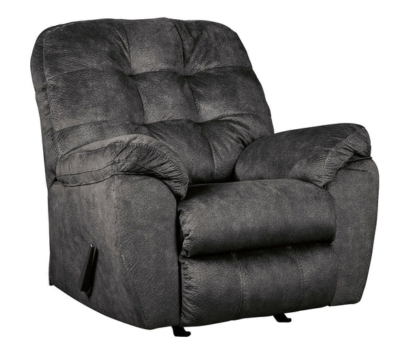Looking for the perfect blend of decadent comfort and contemporary flair? Feast your eyes on this sensational rocker recliner. Tufted box cushioning and thick pillow top armrests brilliantly merge style and a sumptuous feel. Wonderfully plush to the touch, the recliner's granite gray fabric is the ultimate choice for a chic, trendy look.