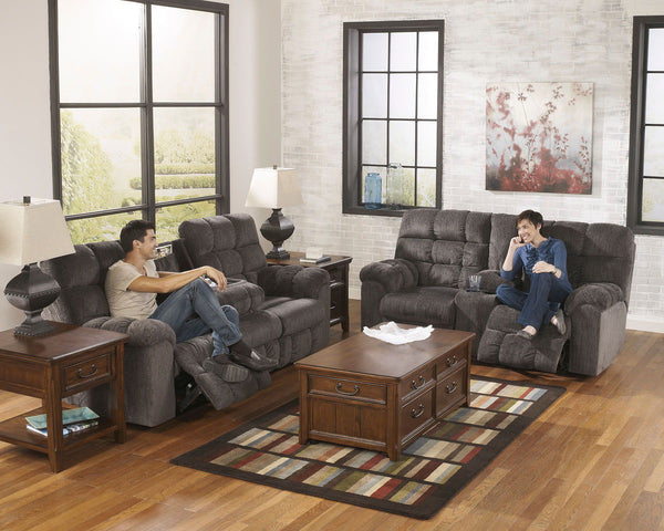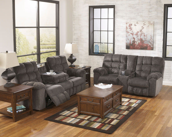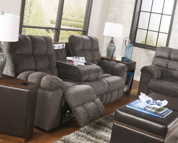 Covered in a plush Chenille upholstery fabric adorned with contemporary styled stitched details, the “Acieona-Slate” upholstery collection features the supportive comfort of thick divided back cushioning and padded arms along with plenty of function like the power strip and USB ports in the wedge and ample storage with a console and drop down table to create the ultimate living room collection.