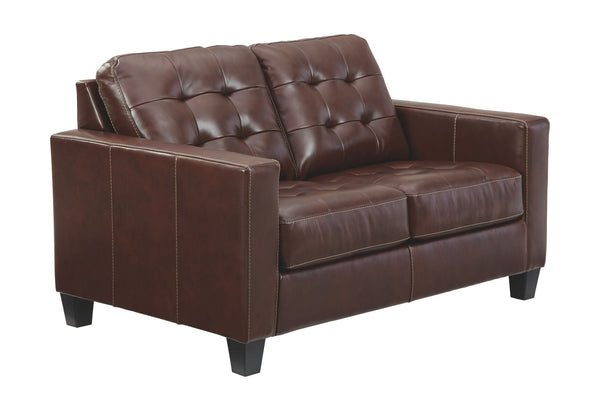 Tailor your space with the tidy structure of this loveseat. Decorative stitching and button tufting on the box cushion make for a very neat appearance. With real leather covering the seating area—where it matters most—this piece has skillfully matched leather elsewhere, so you won’t get hemmed in by the price.