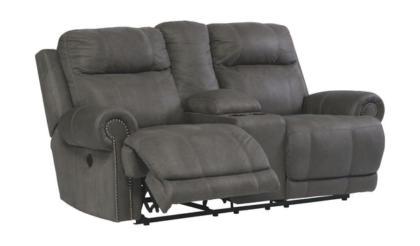 Sparing that "puffy" look you might expect from a recliner, this power reclining loveseat with console doesn't hold back when it comes to contemporary style. Subtle touches such as sporty jumbo stitching, nailhead trim and a "weather worn" effect on the upholstery provide a buttoned-up appeal and fresh feel. Center console with dual cup holders and the perk of one touch reclining put custom comfort at hand.