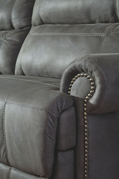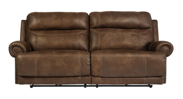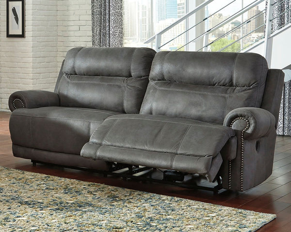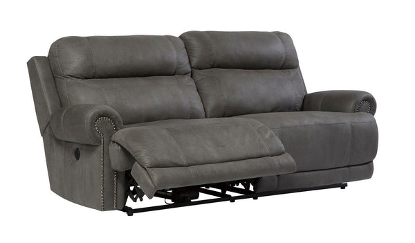 Sparing that "puffy" look you might expect from a recliner, this power reclining sofa doesn't hold back when it comes to contemporary style. Subtle touches such as sporty jumbo stitching, nailhead trim and a "weather worn" effect on the upholstery give this handsome piece a buttoned-up appeal and fresh feel. One touch power means infinite ways to recline in style.