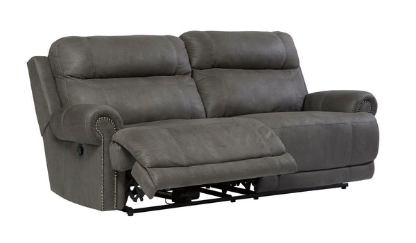 Sparing that "puffy" look you might expect from a recliner, this reclining sofa doesn't hold back when it comes to contemporary style. Subtle touches such as sporty jumbo stitching, nailhead trim and a "weather worn" effect on the upholstery give this handsome piece a buttoned-up appeal and fresh feel.