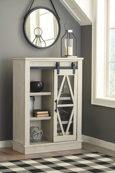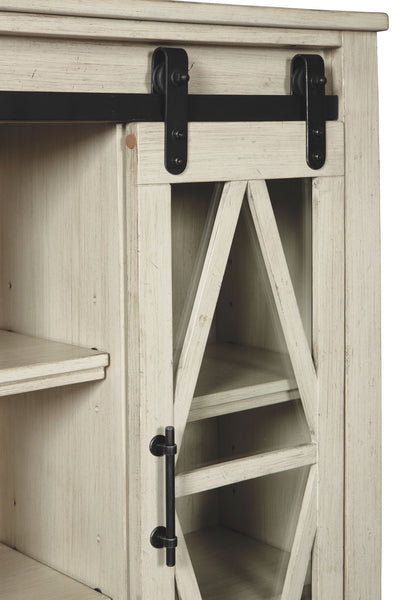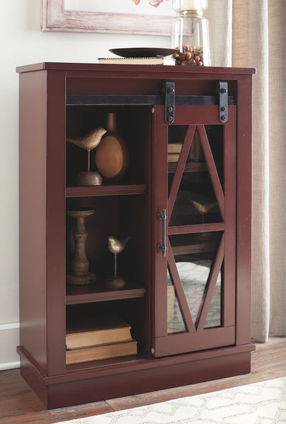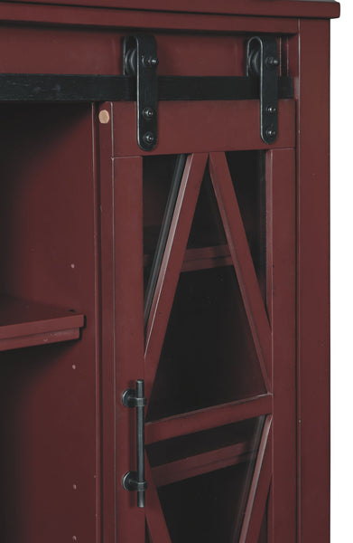 Put your love of modern farmhouse living on display with this accent cabinet. Rich brown finish and sliding "barn door" make it loaded with character. Four adjustable shelves are packed with potential.