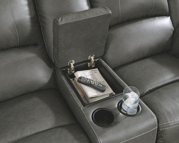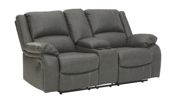 Sleek and streamlined, this reclining loveseat with center console draws out your leisure time with its bustle back construction and thickly cushioned armrests. The super soft faux leather gets a high-end tweak with jumbo contrast stitching so you don’t have to sacrifice style for comfort. Sink into the comfortably supportive cushions and stretch your evening as long as you can with the added convenience of a center console at your fingertips.
