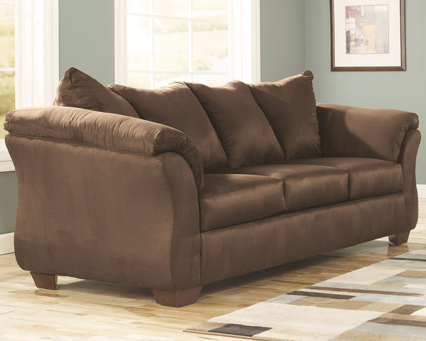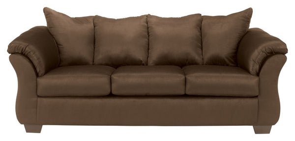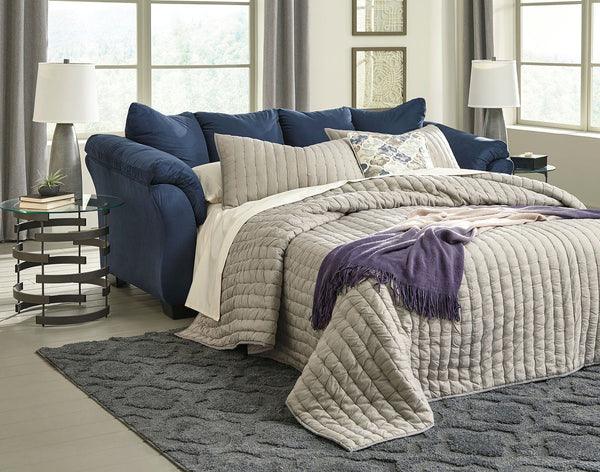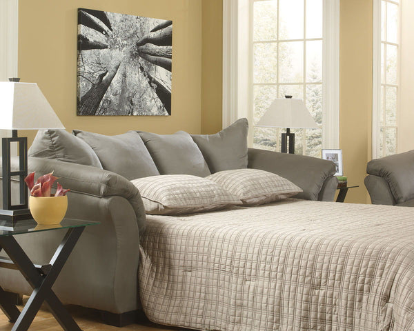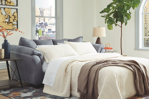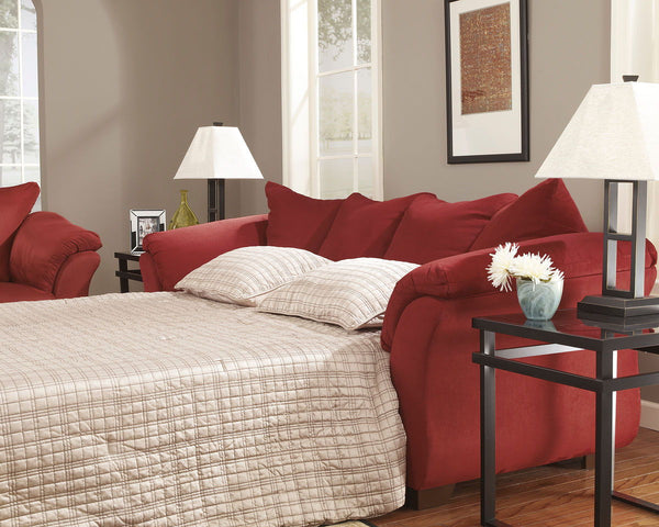 Talk about fine lines and great curves. That’s the beauty of this sofa sleeper—made to suit your appreciation for clean, contemporary style. A striking flared frame, comfy pillow top armrests and an ultra-soft upholstery that holds up to everyday living complete this fashion statement. A pull-out mattress means you’re y prepared for overnight guests.