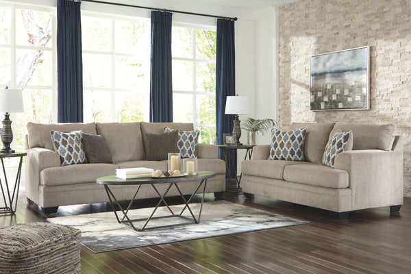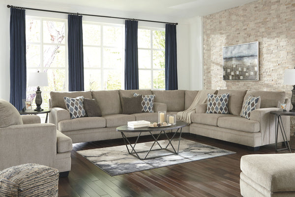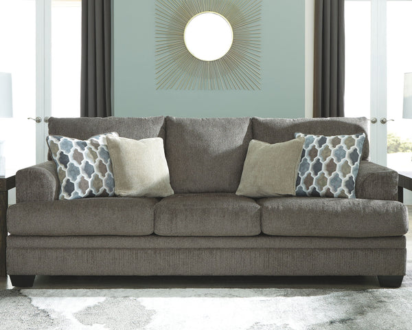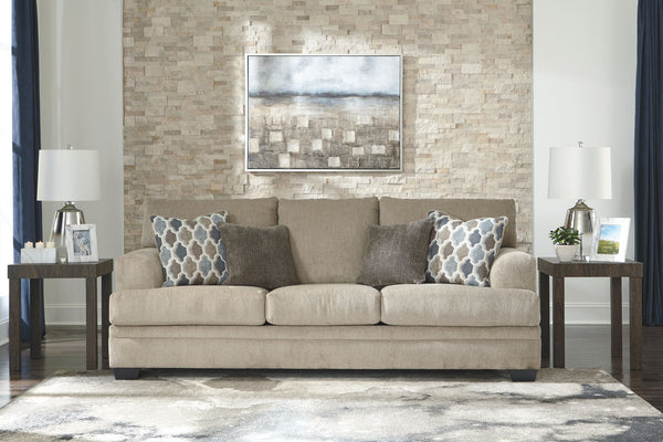 This contemporary sofa has comfort written all over it. From the plush cushions to the textured tan fabric, it’s a total winner for relaxation. Designer throw pillows in blue, brown and tan complement the richly neutral upholstery.