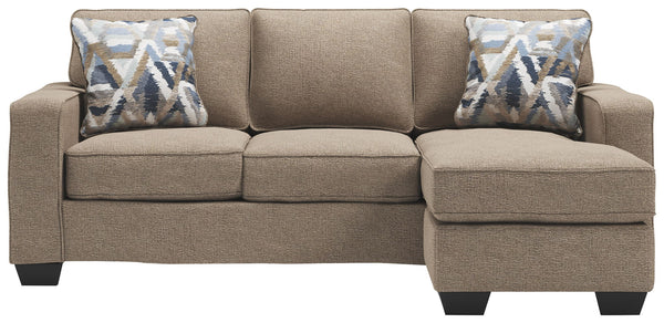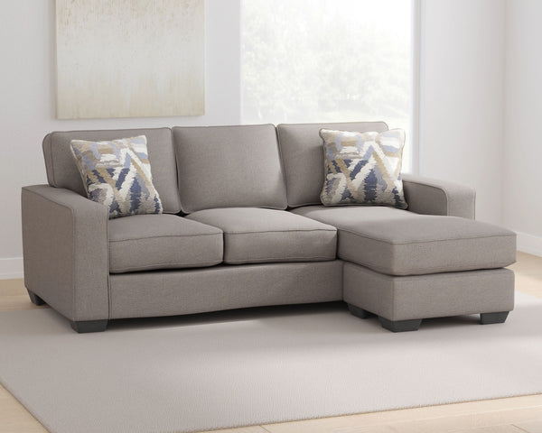 Make your living space that much more livable with this sofa chaise. You’re sure to love its L-shaped design that makes it all too enticing to kick up your heels and relax. The fact that this sofa chaise can be positioned with the chaise on the right or the left only adds to its appeal. And you can rest assured that its ultra-neutral upholstery with a textural chenille feel goes with anything and everything. Wide track armrests, box cushions and tapered feet lend a clean, contemporary aesthetic.