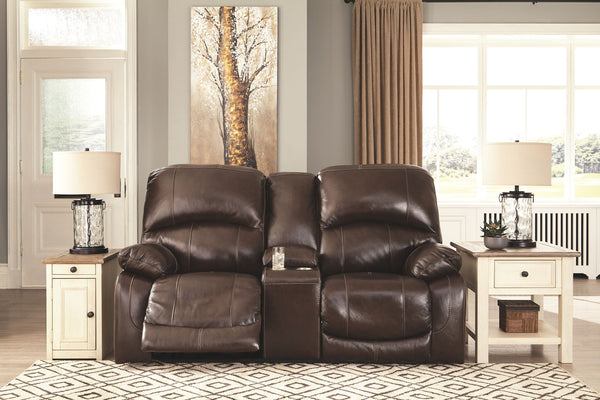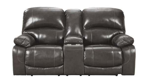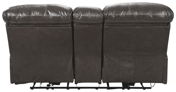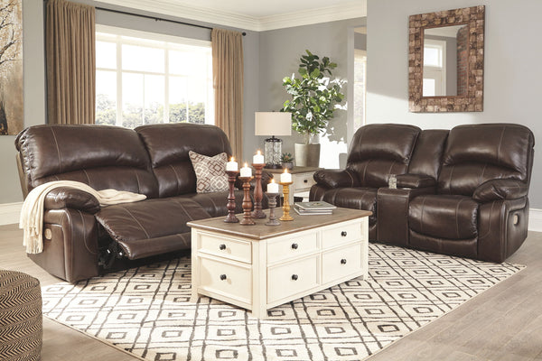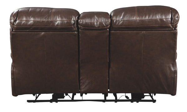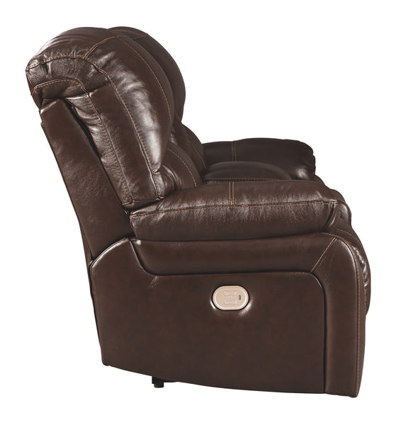 Fashion-forward style. Sumptuous leather feel and appeal. Total comfort at your fingertips. It’s all yours for the taking with this power reclining loveseat with console. Wrapped in a rich chocolate brown upholstery, this decidedly contemporary power loveseat tantalizes the senses in so many ways. Rest assured, the seating area is covered in 100% leather for your pleasure, while a skillfully matched faux leather on the exterior makes luxury affordable. Upping the comfort with 44" high back styling, this power loveseat truly caters from head to toe. An Easy View™ power adjustable headrest allows you to lean back while propping up your head—perfect for chilling out in front of the TV—while an extended ottoman lets you stretch out all the more. And with a USB port in each power control panel, you hardly have to move a muscle to stay powered up.