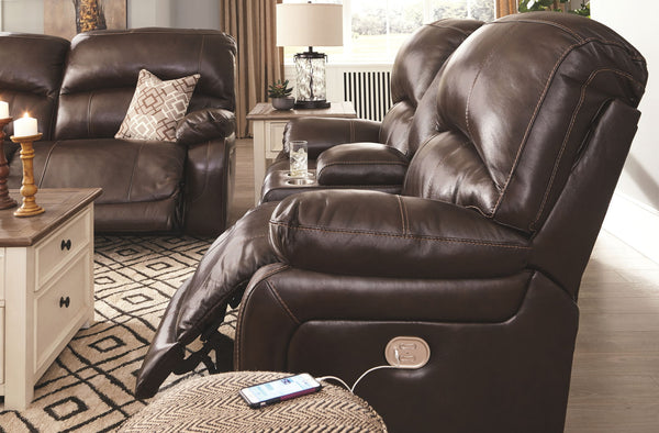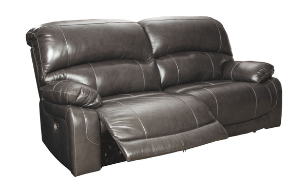 Fashion-forward style. Sumptuous leather feel and appeal. Total comfort at your fingertips. It’s all yours for the taking with this power reclining sofa. Wrapped in a rich charcoal gray upholstery, this decidedly contemporary power sofa tantalizes the senses in so many ways. Rest assured, the seating area is covered in 100% leather for your pleasure, while a skillfully matched faux leather on the exterior makes luxury affordable. Upping the comfort with 44" high back styling, this power sofa truly caters from head to toe. An Easy View™ power adjustable headrest allows you to lean back while propping up your head—perfect for chilling out in front of the TV—while an extended ottoman lets you stretch out all the more. And with a USB port in each power control panel, you hardly have to move a muscle to stay powered up.