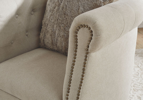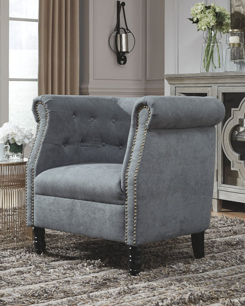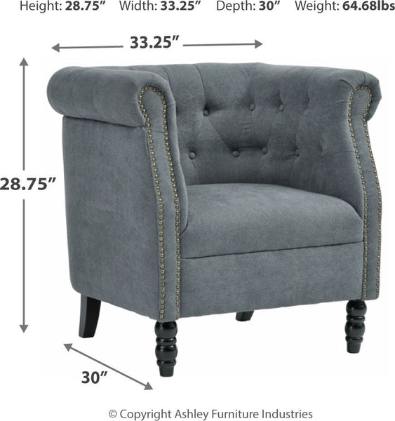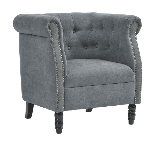 Bring a European style to your home with this accent chair. The slate blue color is sophisticated and subtle while the tufted barrel back and turned wood legs evoke an air of exclusivity. Make your space your own private club with this uptown piece.