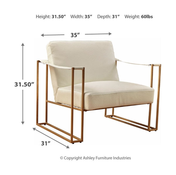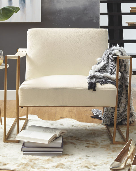 Less is so much more with this ultra-cool accent chair. A mastery in open-concept living, this chair with sturdy metal base is enriched with thickly padded box cushions wrapped in a cream leather with ostrich patterned embossing. Leather armrests are a strapping touch.