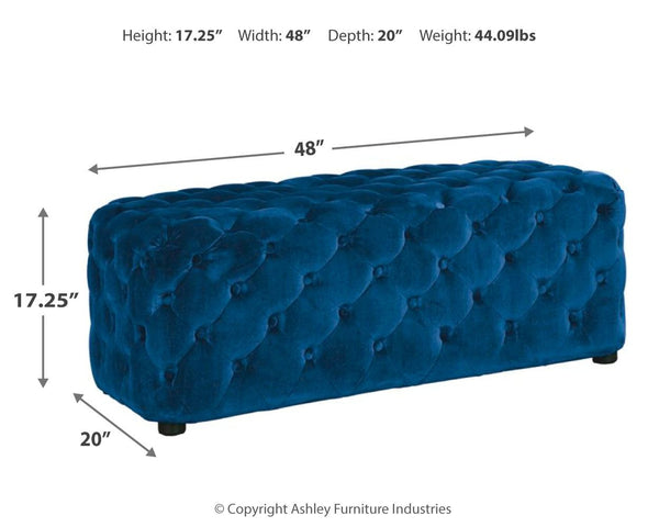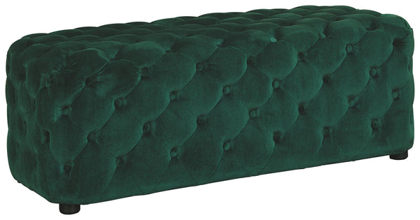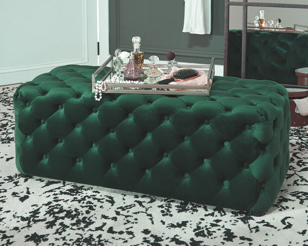 What a gem. This emerald green ottoman adds a distinctive pop of color to your decor, while the deep button tufting in luxurious velvet upholstery puts the accent on comfort. Use this precious prop as an ottoman or bench to suit the occasion.