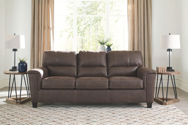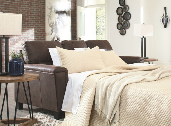 If you love the cool look of leather but long for the warm feel of fabric, you can take comfort in this sofa sleeper. Wrapped in a fabulous faux leather with a weathered hue and hint of pebbly texture to resemble the real deal, this decidedly modern sofa proves less is more. Elements include angled side profiling and track armrests wrapped with a layer of pillowy softness for that little something extra. Prominent jumbo stitching and clean-lined divided back styling lend fashion-forward flair. Rest assured, the memory foam mattress comfortably accommodates overnight guests.