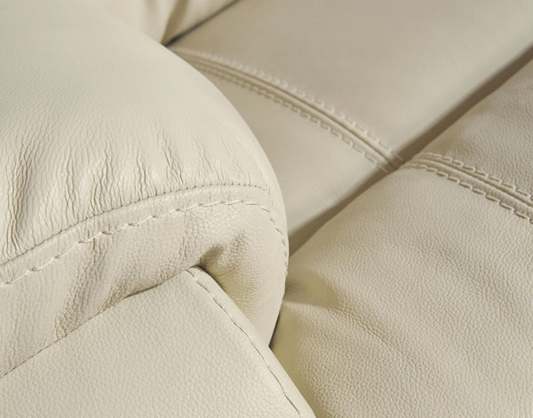 Once you recline in this rocker recliner with the pull of a tab, you will not want to get up. It's that comfortable with a bustle back and padded ottoman. Its look is amazing with dramatic cut and sew lines, jumbo stitching and affordable cream leather match upholstery, which features top-grain leather in the seating areas with skillfully matched vinyl everywhere else—what a way to relax.