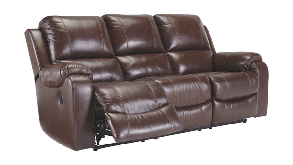 Once you recline in this dual reclining sofa with the pull of a tab, you will not want to get up. It's that comfortable with bustle backs and padded ottomans. Its look is amazing with dramatic cut and sew lines, jumbo stitching and affordable cream leather match upholstery, which features top-grain leather in the seating areas with skillfully matched vinyl everywhere else—what a way to relax.