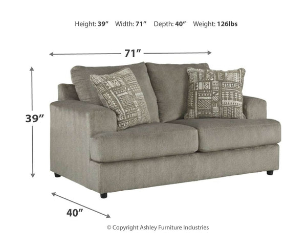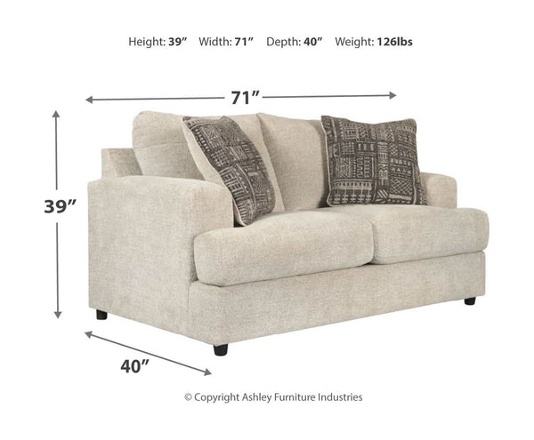 Flaunting a trendsetting silhouette, this loveseat puts the contemporary in your contemporary home. Its “three over two” profile eliminates the center seat cushion, giving you elongated plushness and deep seating. Chunky chenille fabric satisfies your need for a piece that feels as good as it looks. Accented with soft jacquard chenille throw pillows for a splash of geometric pattern and color contrast.