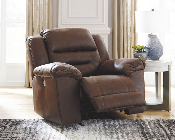For those that love the cool look of leather but long for the warm feel of fabric, this power rocker recliner delivers both with ease. Its high-performance padded faux leather is remarkably durable and easy to clean, just the thing for family spaces. When it’s time to relax, the one-touch power control puts the perfect position at your fingertips. Channel-stitched back cushions provide indulgent lumbar support for maximum seating comfort—not to mention fashion-forward flair.