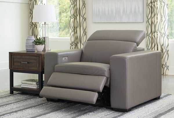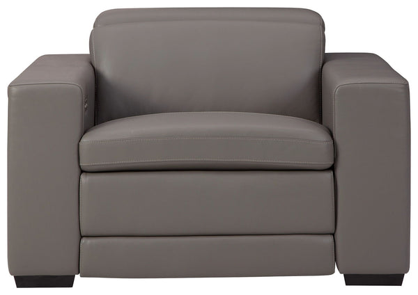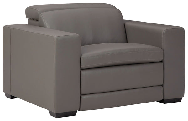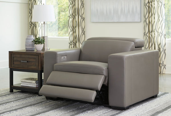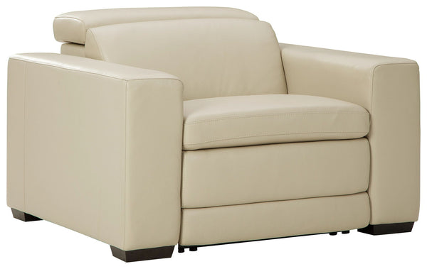 Truly putting high design into recline, this recliner in sandy beige with genuine leather seating area proves that just because you’re a recliner doesn’t mean you have to look like one. Deceptively beautiful, its ultra clean-lined aesthetic is as cool and contemporary as they come. Low-profile back has a super swank look. When you need like more support for your head and neck, the press of a button engages the Easy View™ power adjustable headrest, designed to let you lean back and still have a primo view of the TV. And how’s this for attentive: a zero-gravity design that raises the ottoman height for better blood flow and indulgent pillow top seating an added layer of comfort.