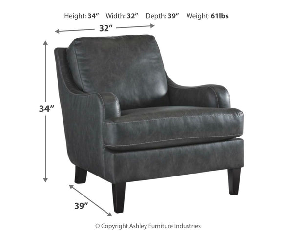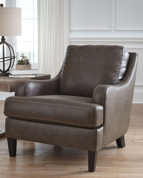 Turning heads with its unique blend of smooth lines and ruggedly handsome looks, this accent chair invites you to take a seat. High-quality faux leather upholstery is comfortably practical and affordable. Details including gently sloped arms accentuated by jumbo stitching incorporate a handsome punch of character.