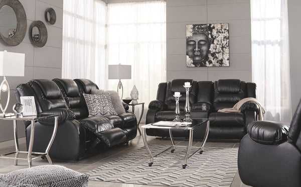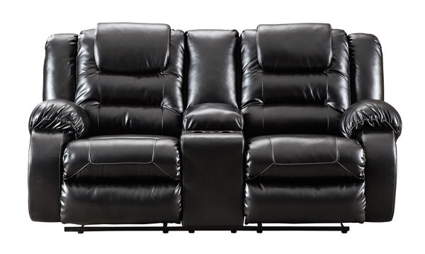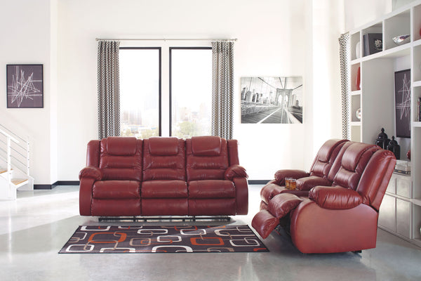 This reclining loveseat puts comfort in style. Plush cushions are stitched to perfection. Ease back into the deep seating to rest your head on the supportive headrest. Supple fabric gives your room the high end look of leather with a spicy pop of color. You’ll love how easy it is to recline in infinite positions of relaxation. Drop a beverage in one of the cup holders, and enjoy sitting here for hours.
