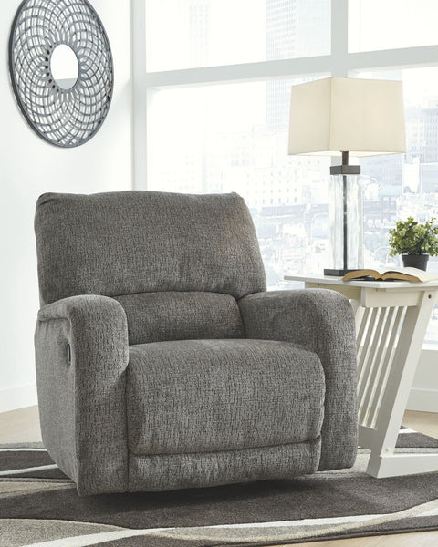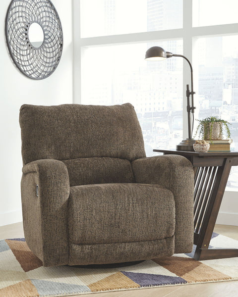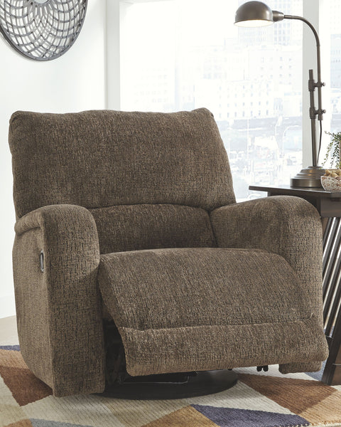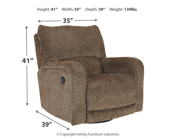 You and plush cushions are two peas in a pod. That’s why this swivel glider recliner will quickly find its way to your heart. Chenille fabric feels so good, you’ll never want to take your hands off of it. Track arms elevate the look with a touch of contemporary sensibility. Ease back into relaxation on the deep seating with one easy pull. Complete with 360-degree swivel, this recliner sets the bar for comfort.