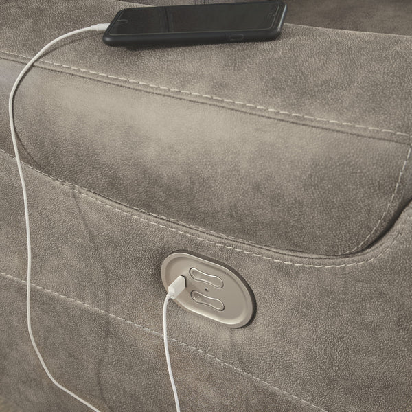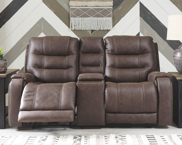 Discover just how much better faux leather can be in this richly styled power reclining loveseat. Outfitted with our latest and greatest padded faux leather with an authentic weathered effect, this ultra-comfortable reclining loveseat with power is the embodiment of everyday luxury. Sporting a 43" high-back design, built-out headrest for added support and extended ottoman, it truly has you covered from head to toe. An Easy View™ power adjustable headrest lets you fully recline and still have a primo view of the TV. Plus, you can chill out while you recharge thanks to a USB charging port in the one-touch power control. And how about a storage console with hidden cup holders and built-in wood-tone tabletop? We’ll drink to that.