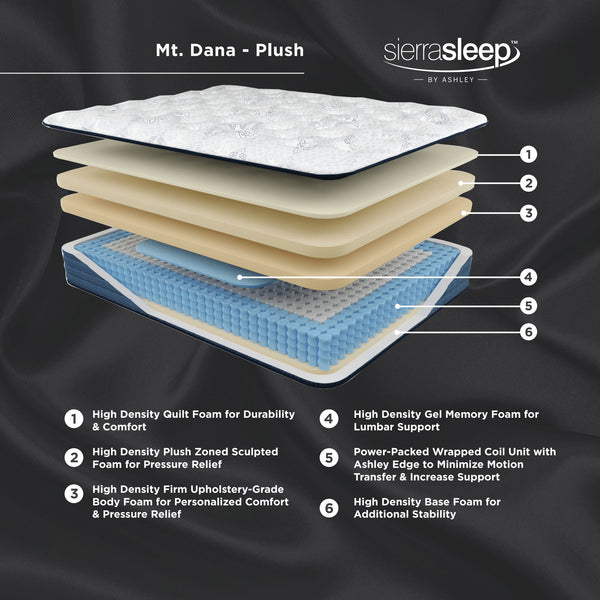 Love a plush, pillowy feel, but need a higher level of support? Look no further than this plush mattress. Five different levels of high-density foam—including plush pressure-relieving foam and gel memory foam for temperature regulation—work in concert to provide the ideal balance of comfort and support. Rest assured, a power packed wrapped steel unit offers reinforced structural support where you need it most, while 13-gauge wrapped coils provide edge support for a larger sleep surface and supportive sitting surface. Foundation/box spring available, sold separately.