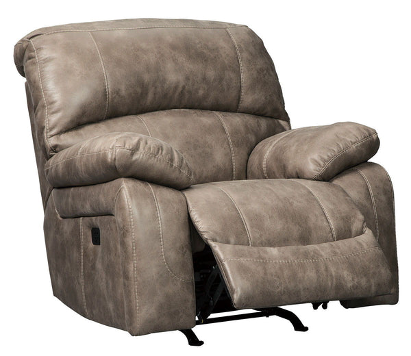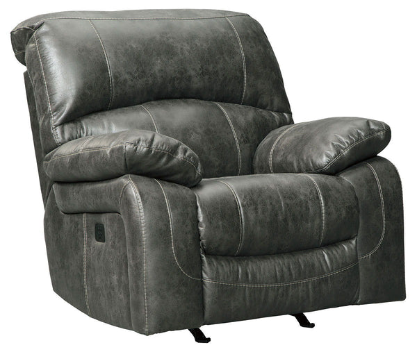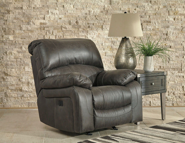 There is power in beauty with this power rocker recliner. Handsome crackle effect in the upholstery gives the appearance of supple leather but this recliner is all about the warmth of fabric. Contrast jumbo stitching adds a stylish touch. Double stuffed armrests cuff your body in comfort. Adjust your head and recline back with one easy touch.